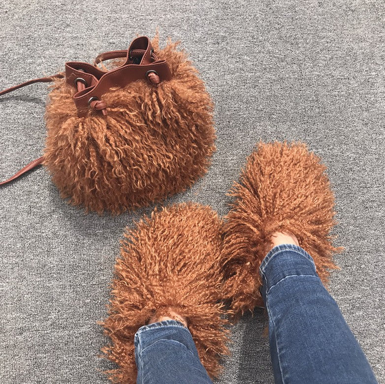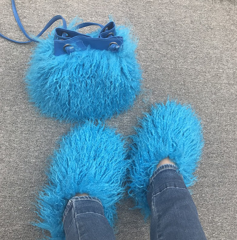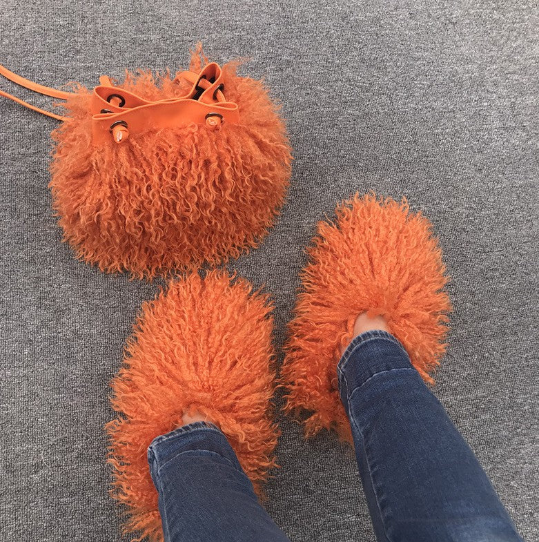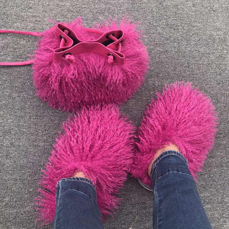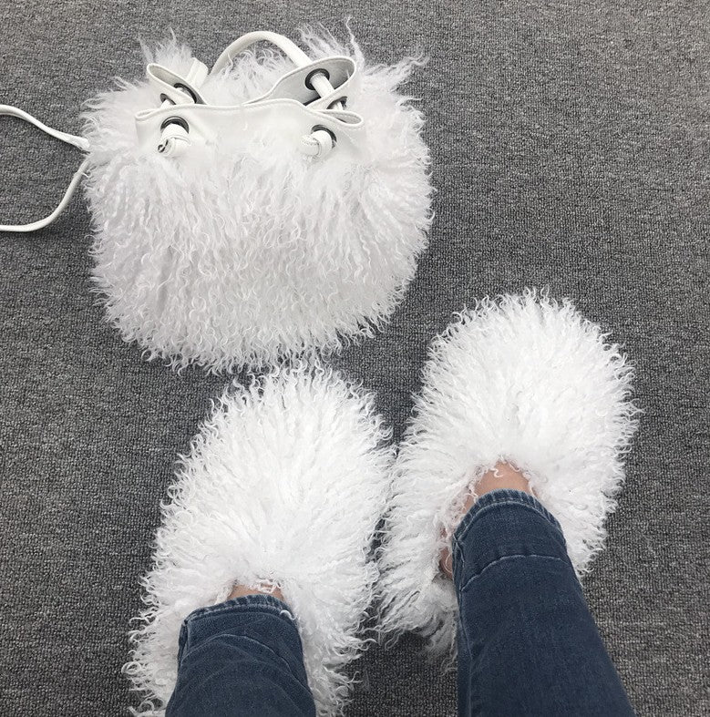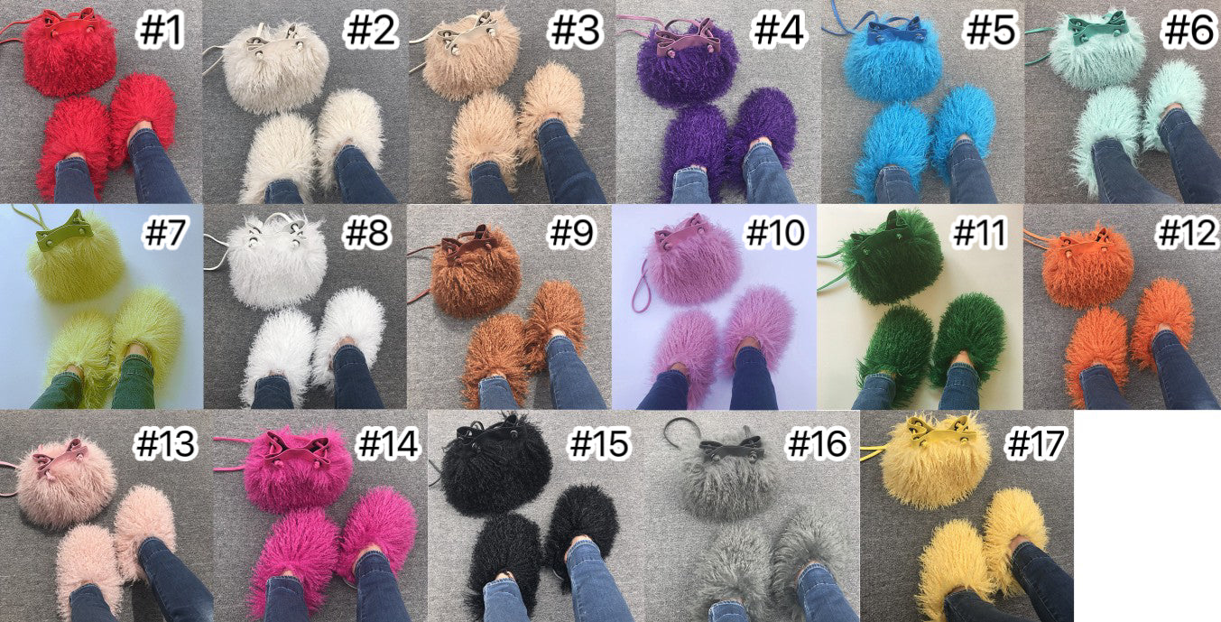 Women Fashion Furry Slides with Bag Set